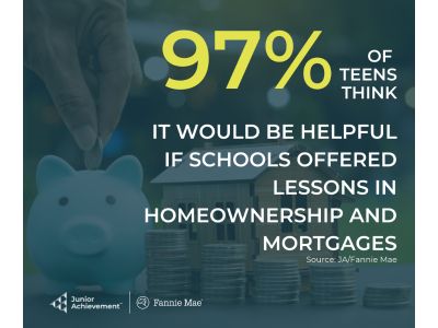 Junior Achievement USA and Fannie Mae collaborated on a survey to better understand teens' perspectives on homeownership, specifically the desirability of owning a home one day. The survey also explored teens’ understanding of mortgages and credit scores, as well as the value they place on having financial literacy education programs in high school that cover these and other concepts related to homeownership. The survey of 1,000 U.S. teens between the ages of 13 and 17 was conducted from May 25 through May 31, 2022, by Wakefield Research. The Junior Achievement and Fannie Mae Youth Homeownership Survey Executive Summary contains an overview of those findings.